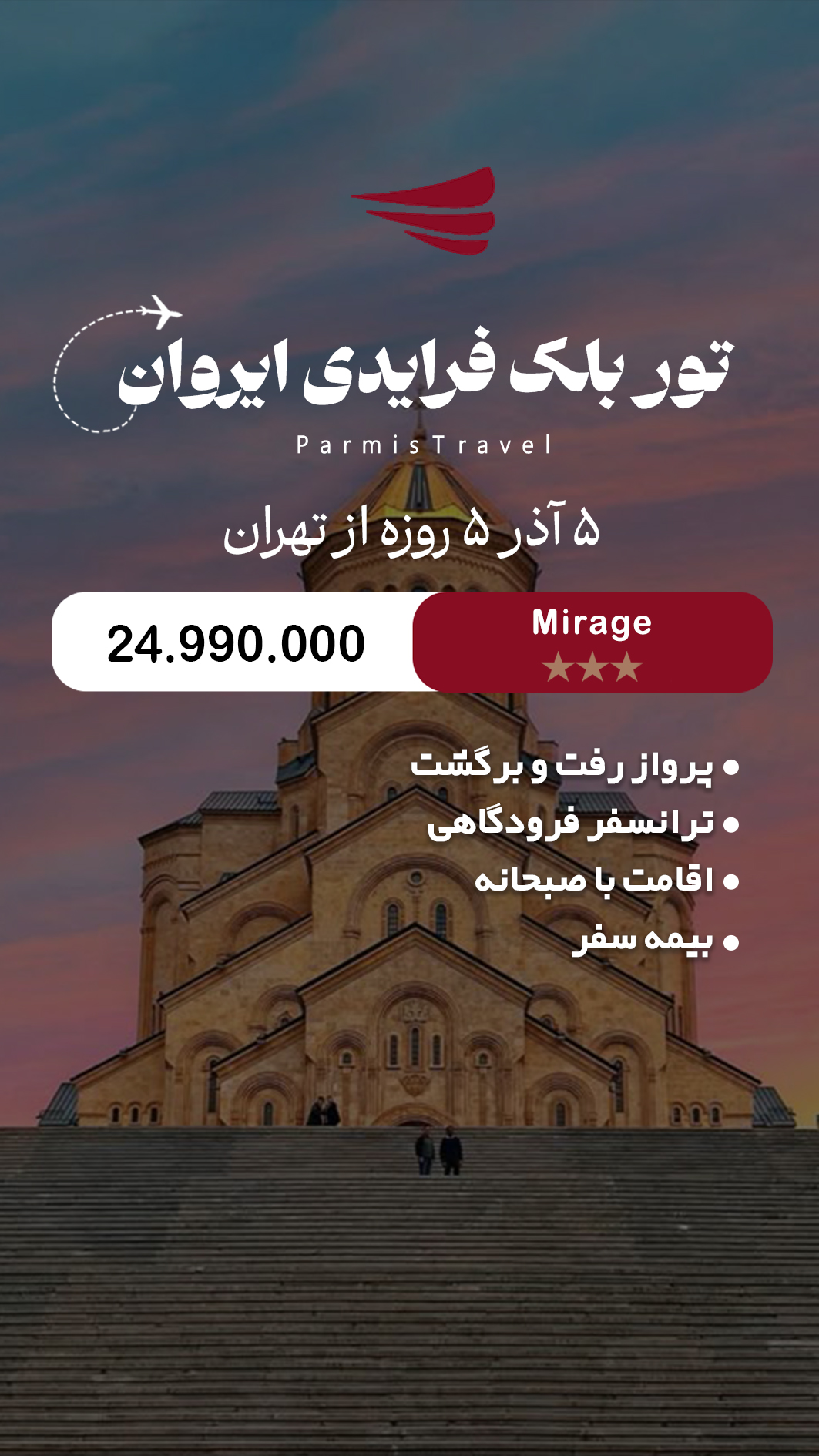 خدمات:پرواز رفت و برگشت -ترانسفر-بیمه-صبحانه-اقساط
