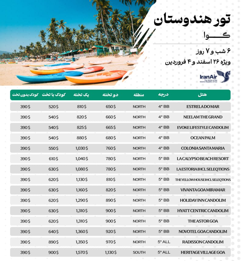 خدمات سفر پرواز رفت و برگشت با هواپیمایی ایران ایر ، ۶ شب اقامت در هتل با صبحانه ، ویزای توریستی ، پرواز داخلی ،